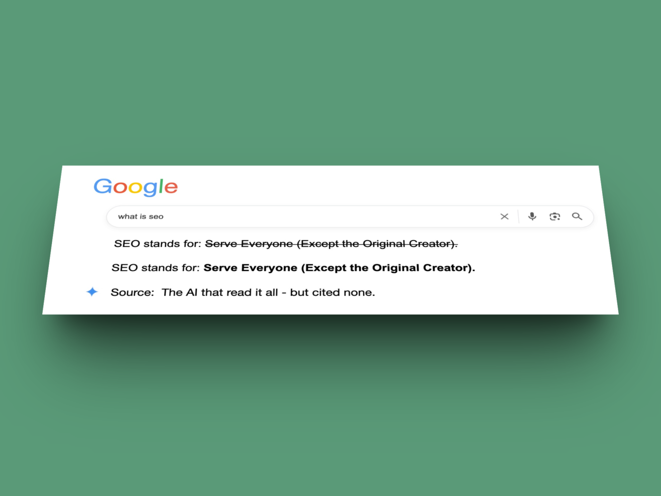 Travel blogs, food sites, independent journalism, home renovation guides: all of it is being soaked up by the great AI sponge. But it’s not scraped and stored in some dataset. It’s being summarized, repackaged, and displayed right there in the search results. And with that, SEO becomes meaningless. The rules creators played by for years to make their work visible are quietly being rewritten.