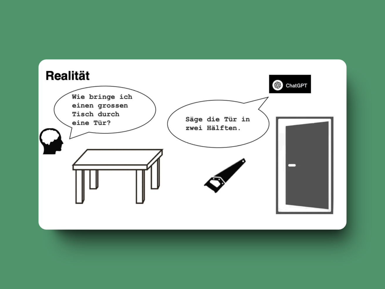 Das Publikum zum Lachen brachte die folgende Anekdote: Noch vor wenigen Jahren antwortete ChatGPT auf die Frage, wie man einen zu grossen Tisch durch eine Tür bringt, wie folgt: «Sägen Sie die Tür in zwei Hälften». Auch wenn es heute die Frage richtig beantwortet, muss uns bewusst sein: gesunder Menschenverstand fehlt dieser Technologie nach wie vor.