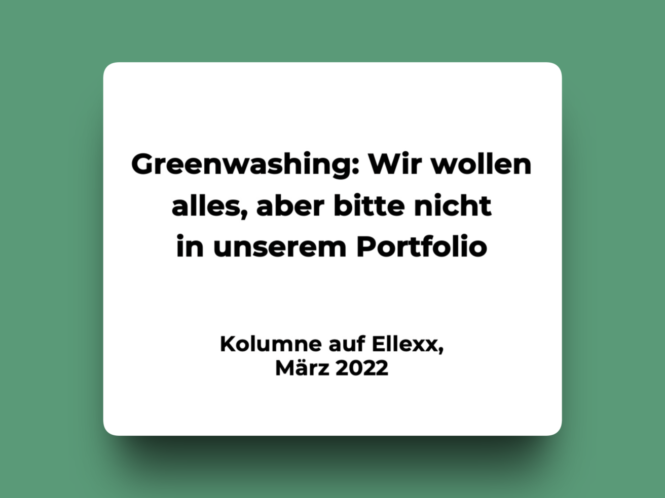 „Rosa X verlegte vor Kurzem ihr Anlagekonto auf eine neue, hippe Online-Vermögensplattform. Sie tat das, weil sie ihr Geld in möglichst umweltfreundliche Unternehmen investieren wollte. Als sie jedoch sah, was in ihrer nachhaltigen Portfolio-Option, die angeblich Unternehmen mit hohen Umwelt-, Sozial- und Governance-Standards (sogenannte ESG-Standards) bevorzugte, drinsteckte, war sie entsetzt: Die grössten Anteile in ihrem neuen Portfolio waren nicht etwa Wind- und Solarunternehmen, sondern Bankaktien. Noch schlimmer: Es fanden sich sogar Aktien von Ölfirmen darunter!“
